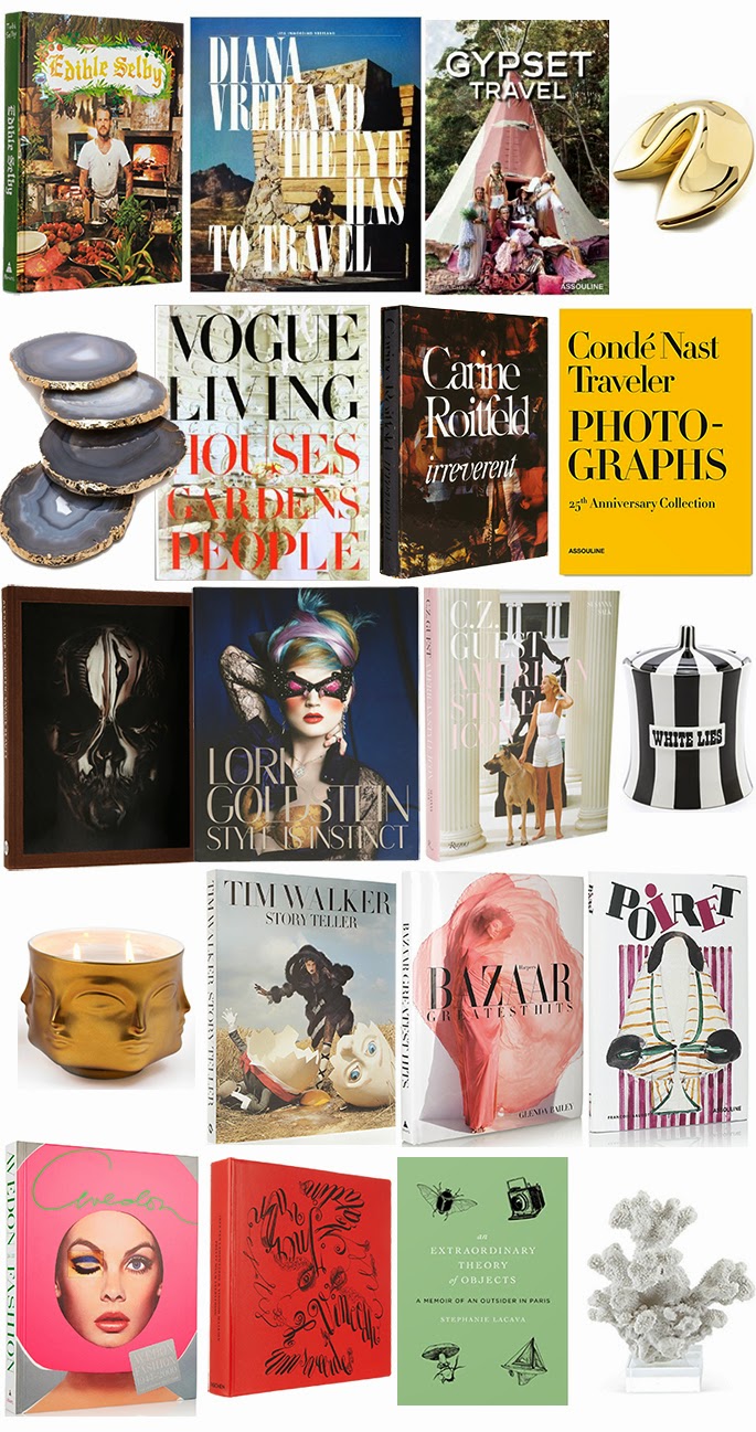 First row: Edible Selby // The Eye Has to Travel // Gypset Travel // Fortune Cookie Box // Second row: Gilded coasters // Vogue Living // Carine Roitfeld Irreverent // Conde Nast Traveler // Third row: Alexander McQueen Savage Beauty // Style is Instinct // American Style Icon // Jonathan Adler jar // Fourth row: Jonathan Adler Muse candle // Tim Walker Story Teller // Harpers Bazaar Greatest Hits // Poiret // Fifth row: Avedon // Pretty Much Everything // An Extraordinary Theory of Objects // Coral sculpture