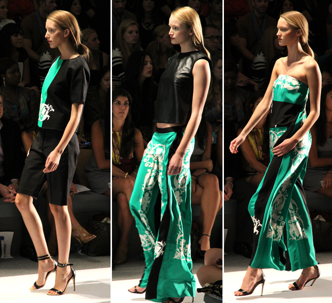 I love a good color story and Rachel Roy certainly delivered just that. The gem tone greens, cerulean blues, rich eggplant purples and earthy yellows -- combined in such fun ways! My favorite has to be the chunky knit kelly green sleeveless sweater paired with a royal blue turtleneck underneath and an a-line leather skirt. The silhouette is perfectly simply but the color juxtaposition gives it some extra oomph.